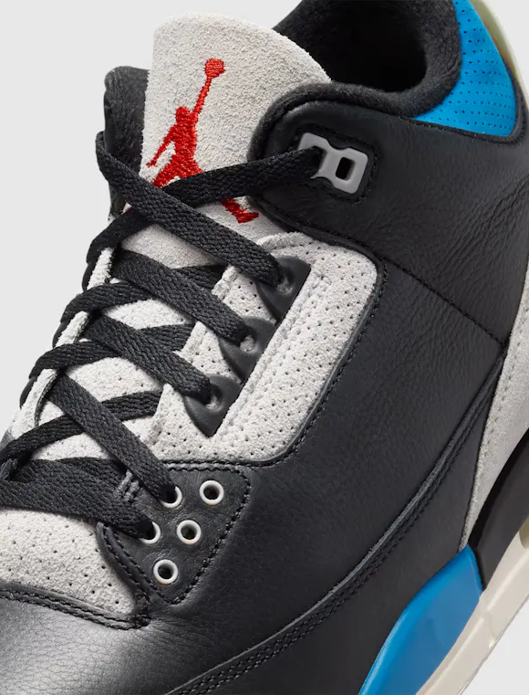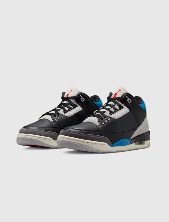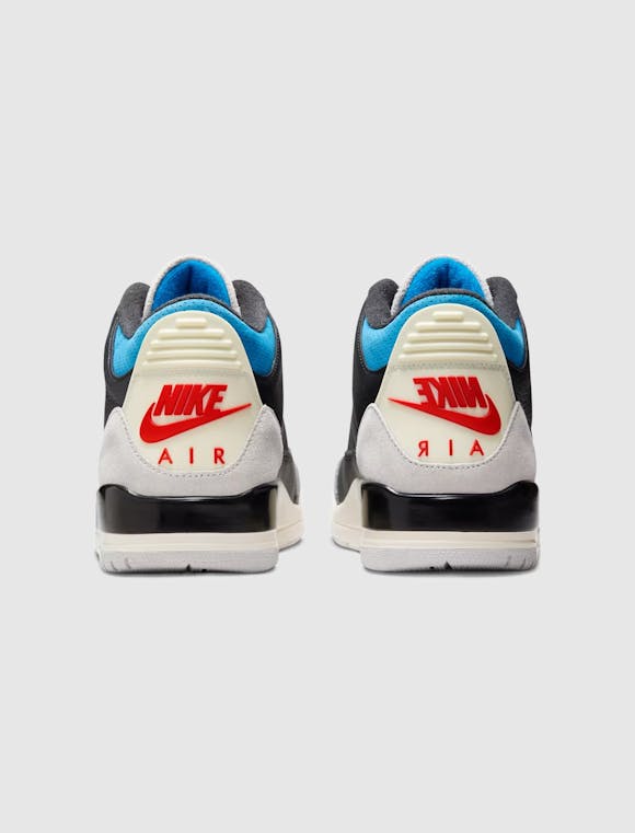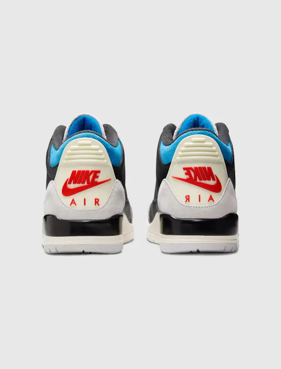 Low top sneakers. Leather toe box and side panels. Suede overlays around the toe, and outer heel counter. Suede tongue. Embroidered logo on the tongue. Perforated leather collar. Front lacing. Foam midsole. Exposed air unit at the heel. Rubber outsole.