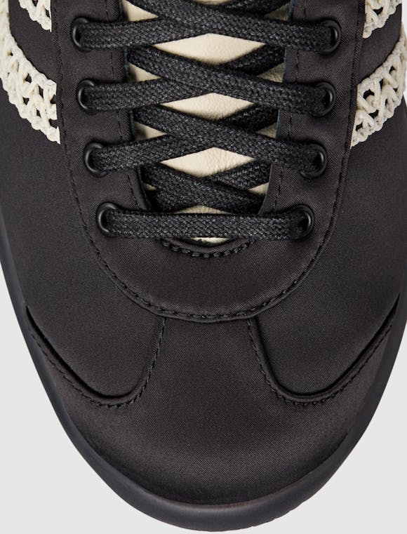 Low top sneakers. Satin upper. Satin overlay stitched on the toe. Crochet stripe motifs stitched on the side panels. Front lacing. Padded satin tongue with a tag stitched at the center. Low profile rubber outsole. Satin upper