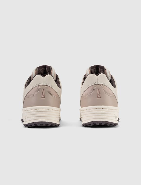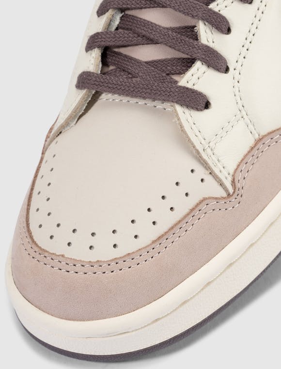 Low top sneakers. Suede overlays around the toe. Perforated toe box, and side panels. Leather overlay around the collar. Suede heel counter. Padded leather tongue with a polyester tag stitched at the top. Front lacing. Rubber midsole. Rubber outsole.