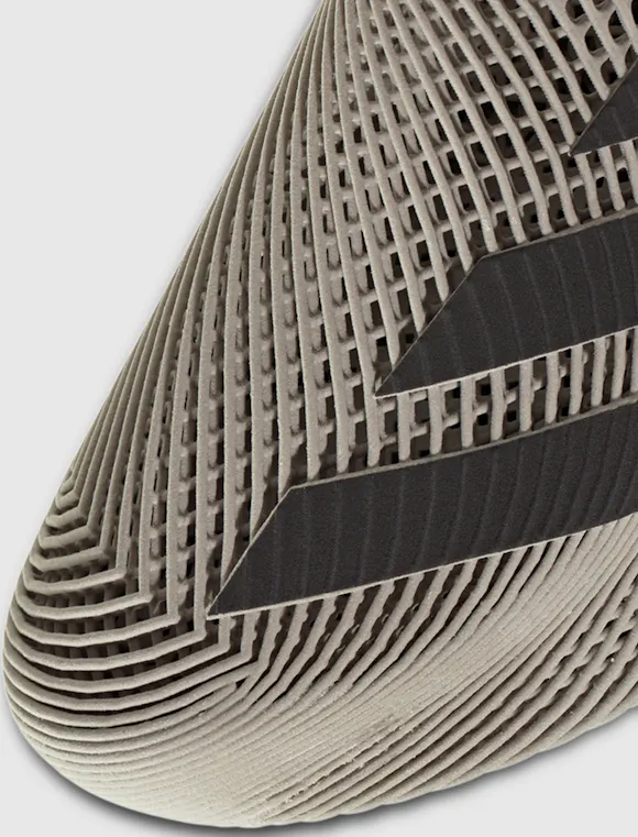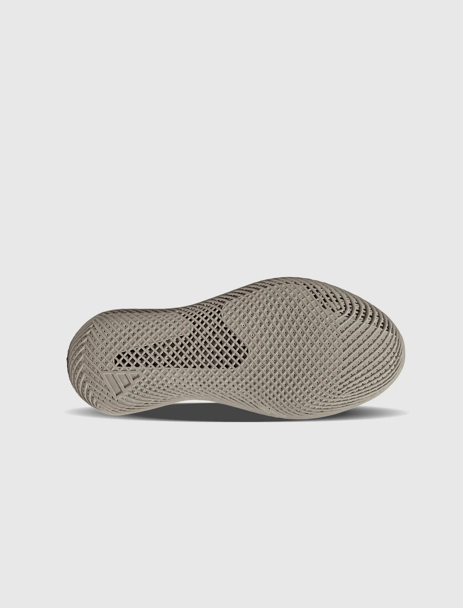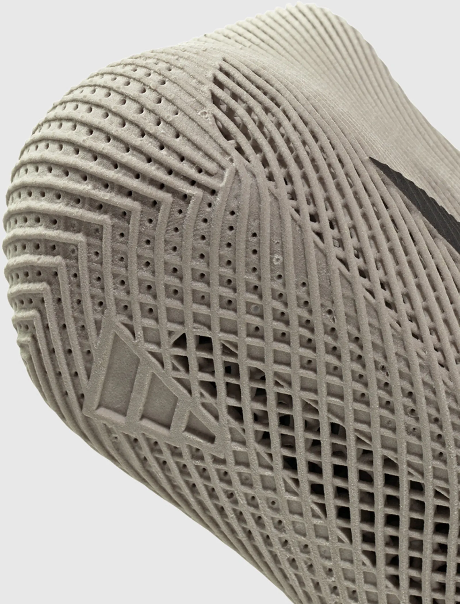 Low top shoe. One-piece 3D printed lattice upper. Uses Climacool technology for airflow. Stripe motifs printed on the outer side panels. 3D printed polymer