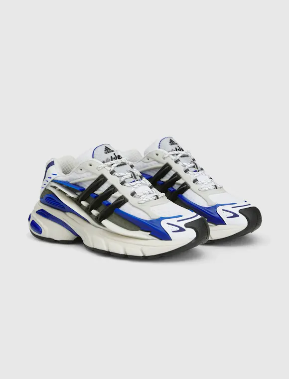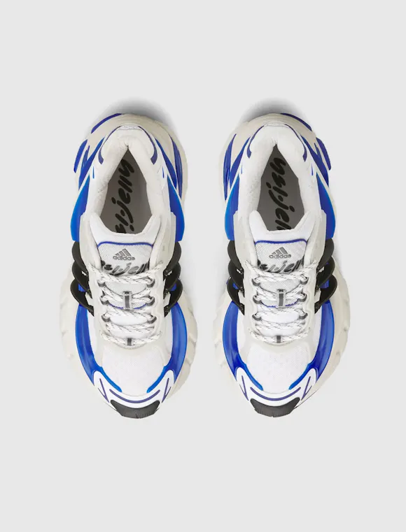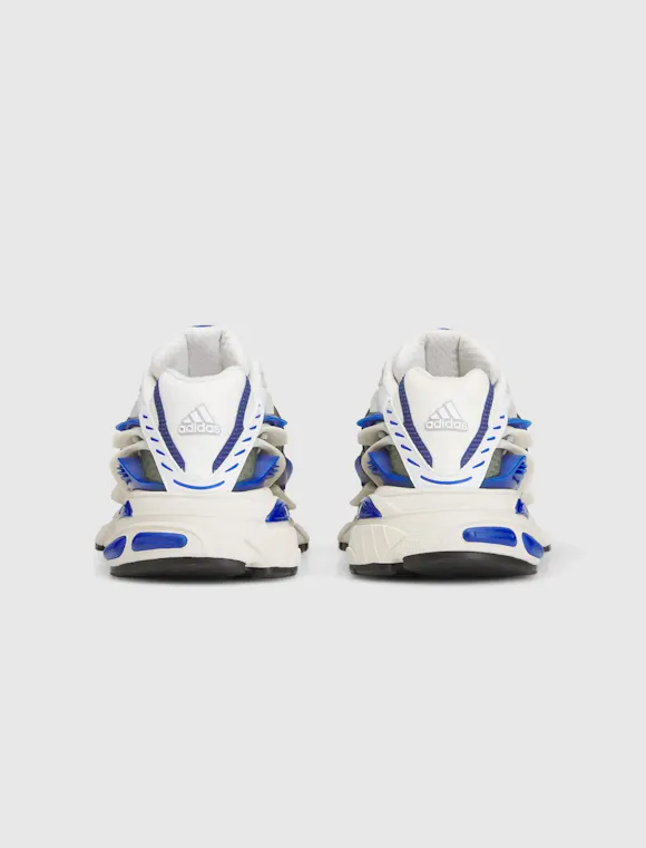 Low top sneaker. Sculptural 3D molded TPU overlays that resemble a jellyfish exoskeleton. Airy mesh base paired with layered panels. Front lacing. Thick foam midsole equipped with Adiprene cushioning. Chunky rubber outsole. Mesh, and TPU upper