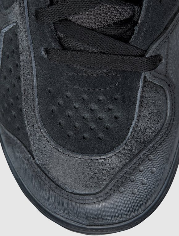 High top boots. Leather, and suede upper. Leather stripes stitched on the side panels. Perforated outer toe panels, and collar. Front lacing. Composite foam midsole. Rubber outsole. Leather, and suede upper