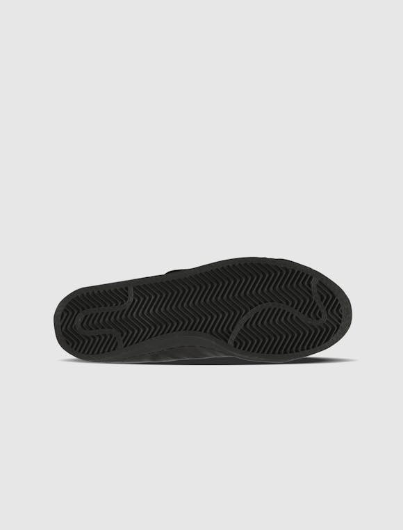 Low top sneakers. Leather upper. Rubber toe overlay. Leather stripe motif patches on the side panels. Front lacing. Leather flap lace cover with stamped branding at the center. Rubber midsole. Rubber outsole. Leather upper