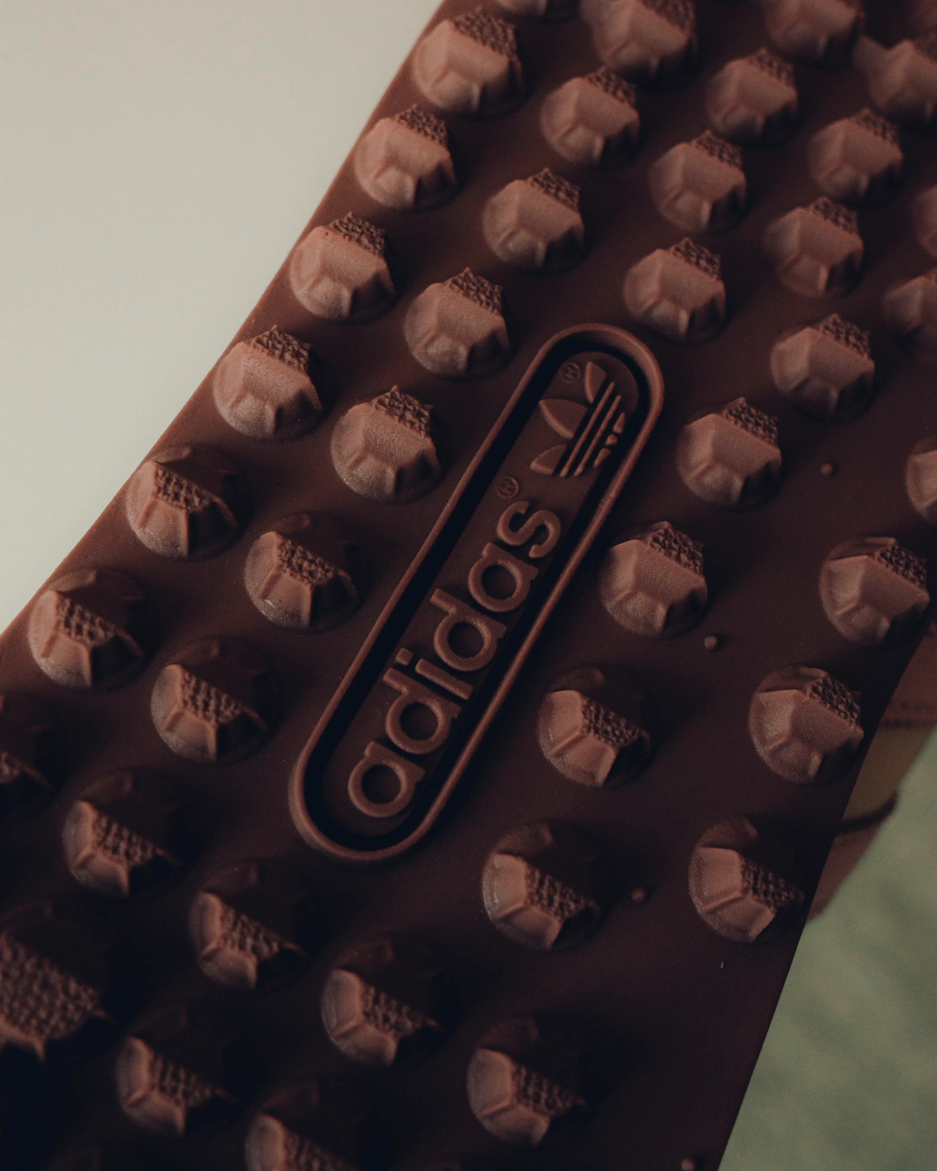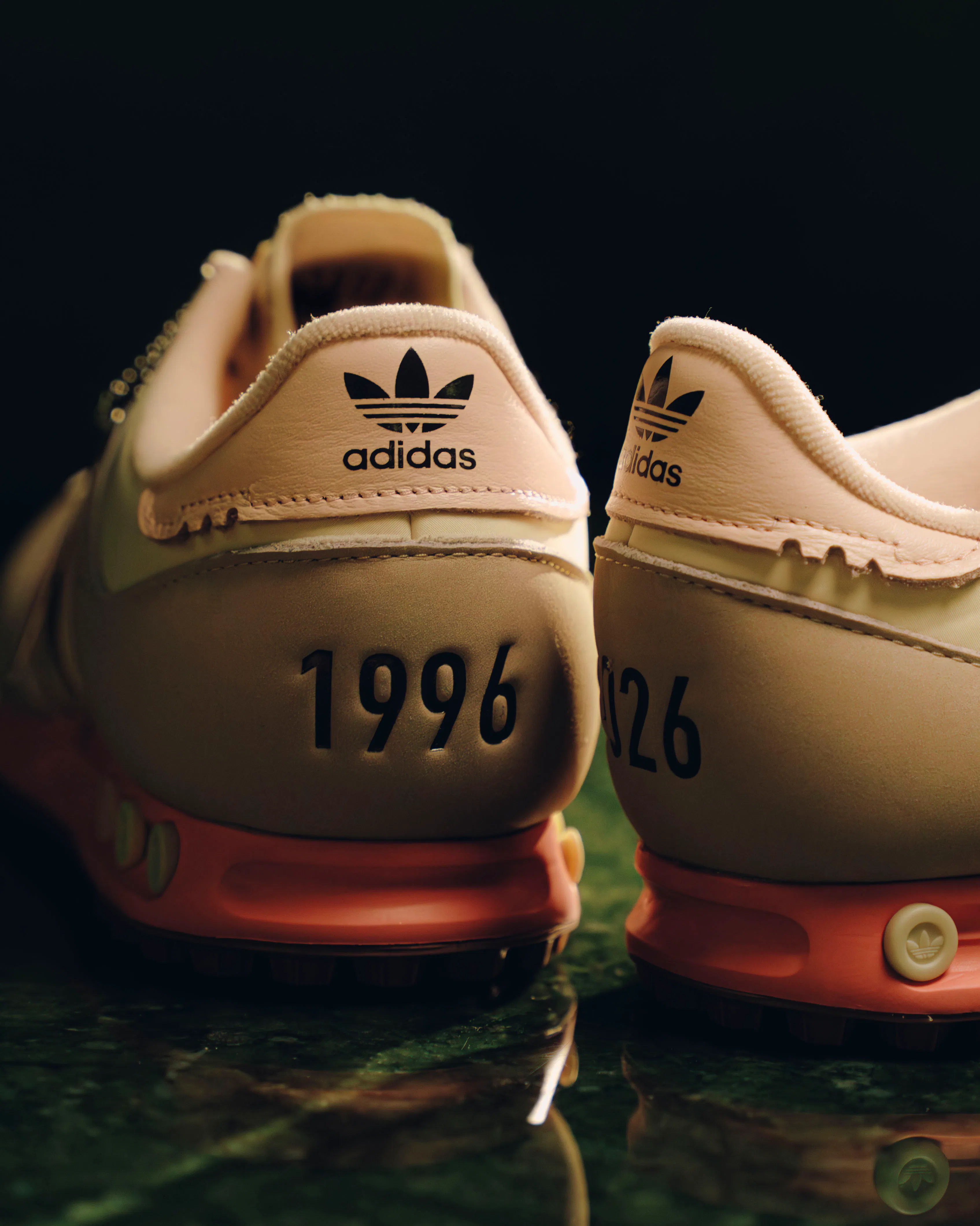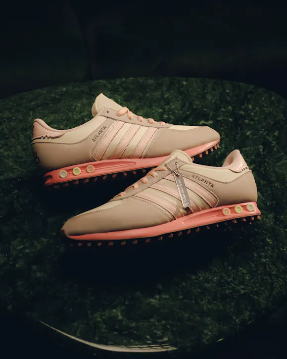 Low top sneakers. Mesh upper. Suede overlays around the toe, eyelet panels, and heel counter. Leather stripe motif patches on the side panels. Leather tongue. Front lacing. Composite foam midsole wrapping in nylon netting. Rubber outsole. Suede, and mesh upper