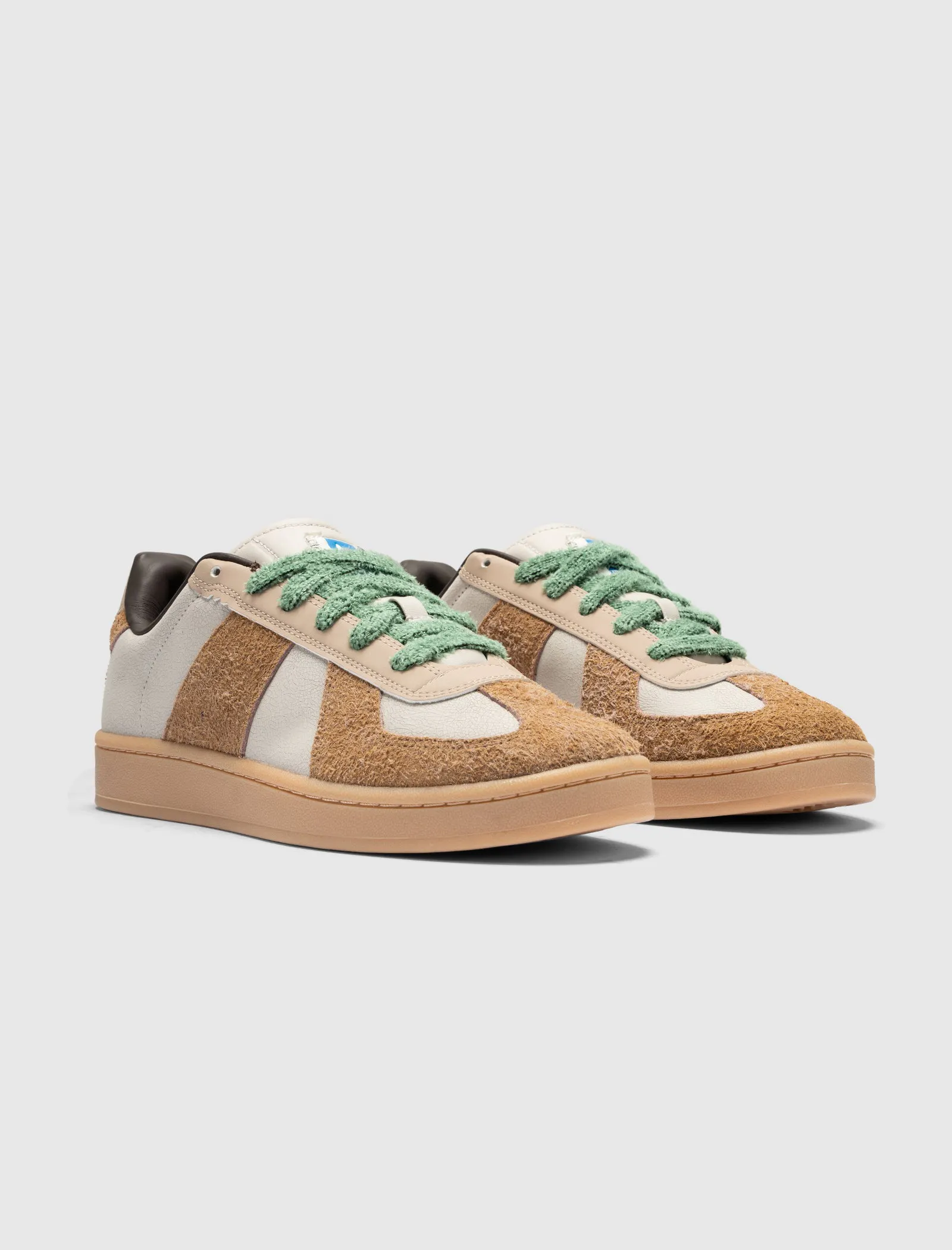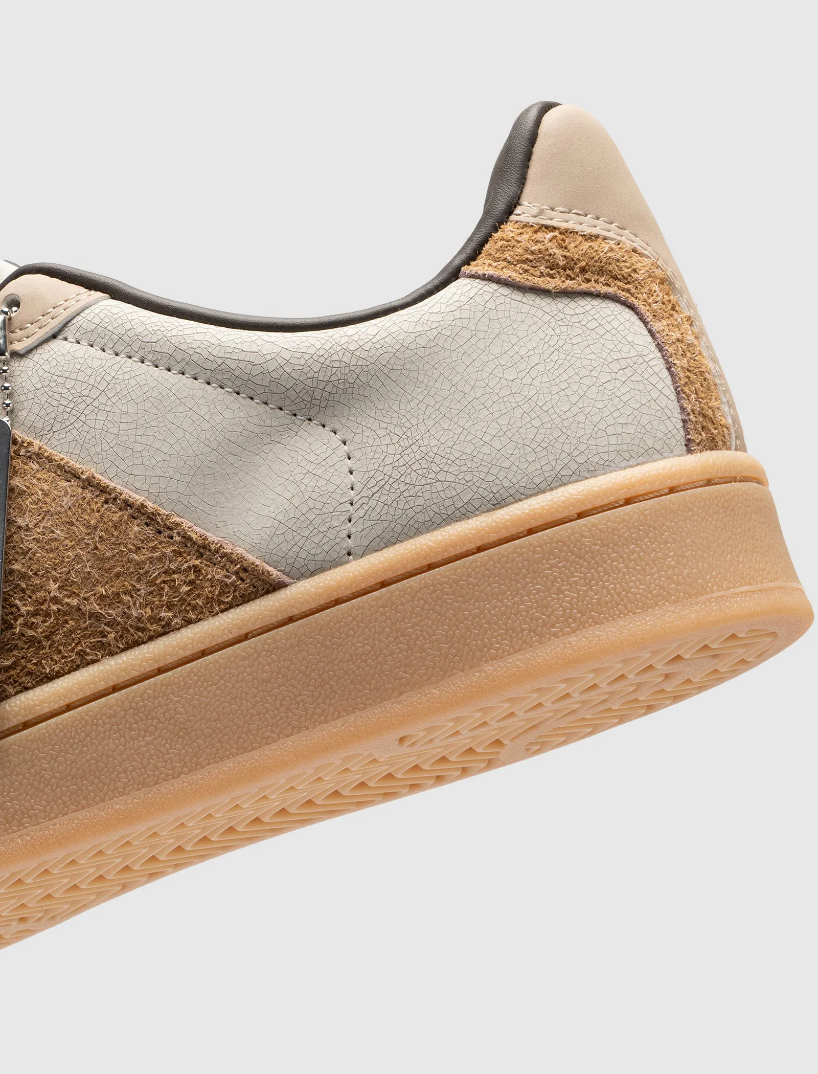 Low top sneakers. Cracked leather upper. Leather overlays around the eyelet panels, and back of collar. Suede accent panels on the toe, and side panels. Leather tongue. Fuzz front lacing. Rubber midsole. Rubber outsole. Leather, and suede upper