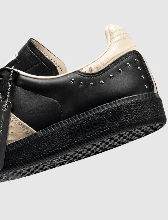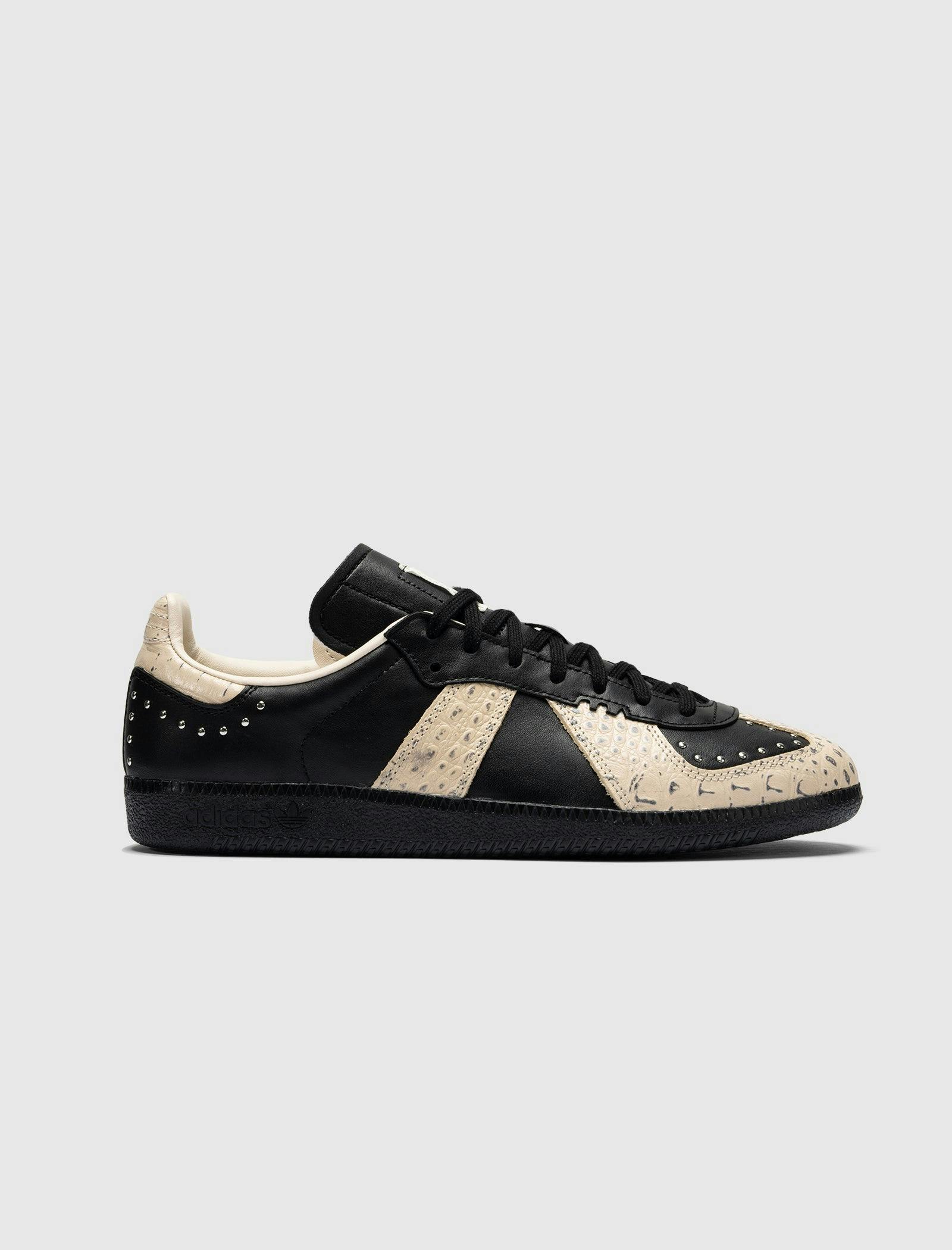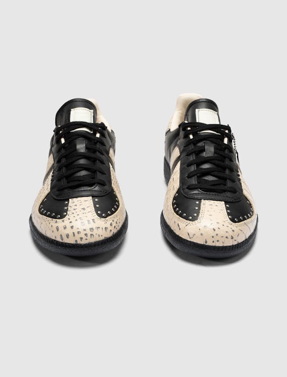 Low top sneakers. Leather upper. Studded accents. Texture stamped leather overlays around the toe, eyelet panels, side panels, and back of collar. Front lacing. Leather tongue. Leather patch stitched on the tongue with a stamped logo motif. Rubber midsole. Rubber outsole. Leather upper