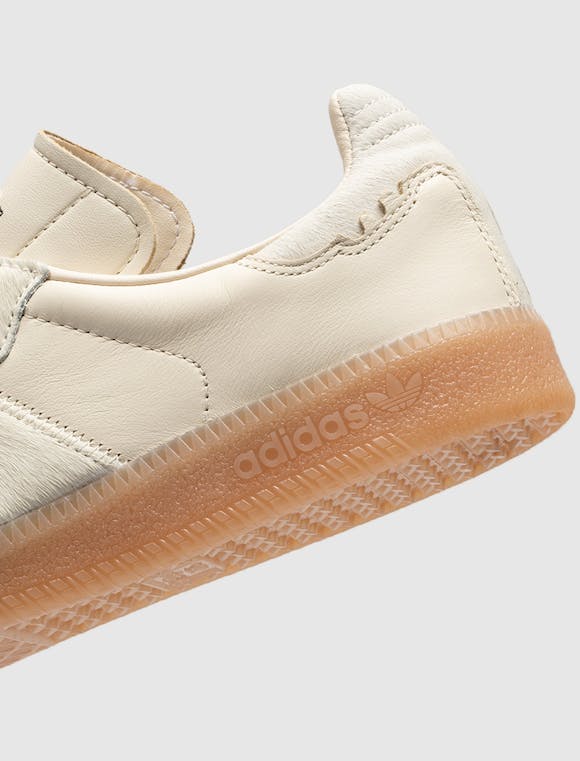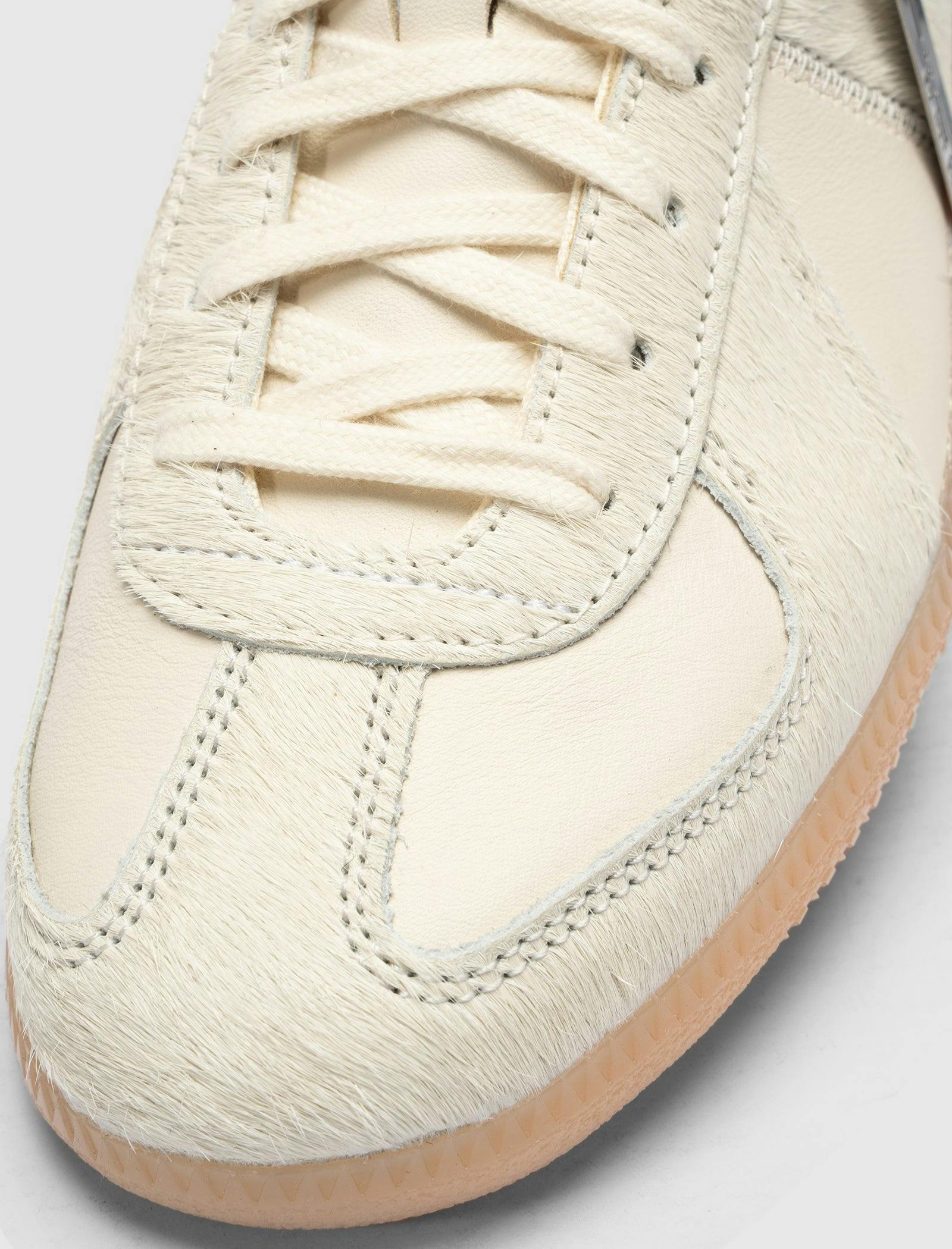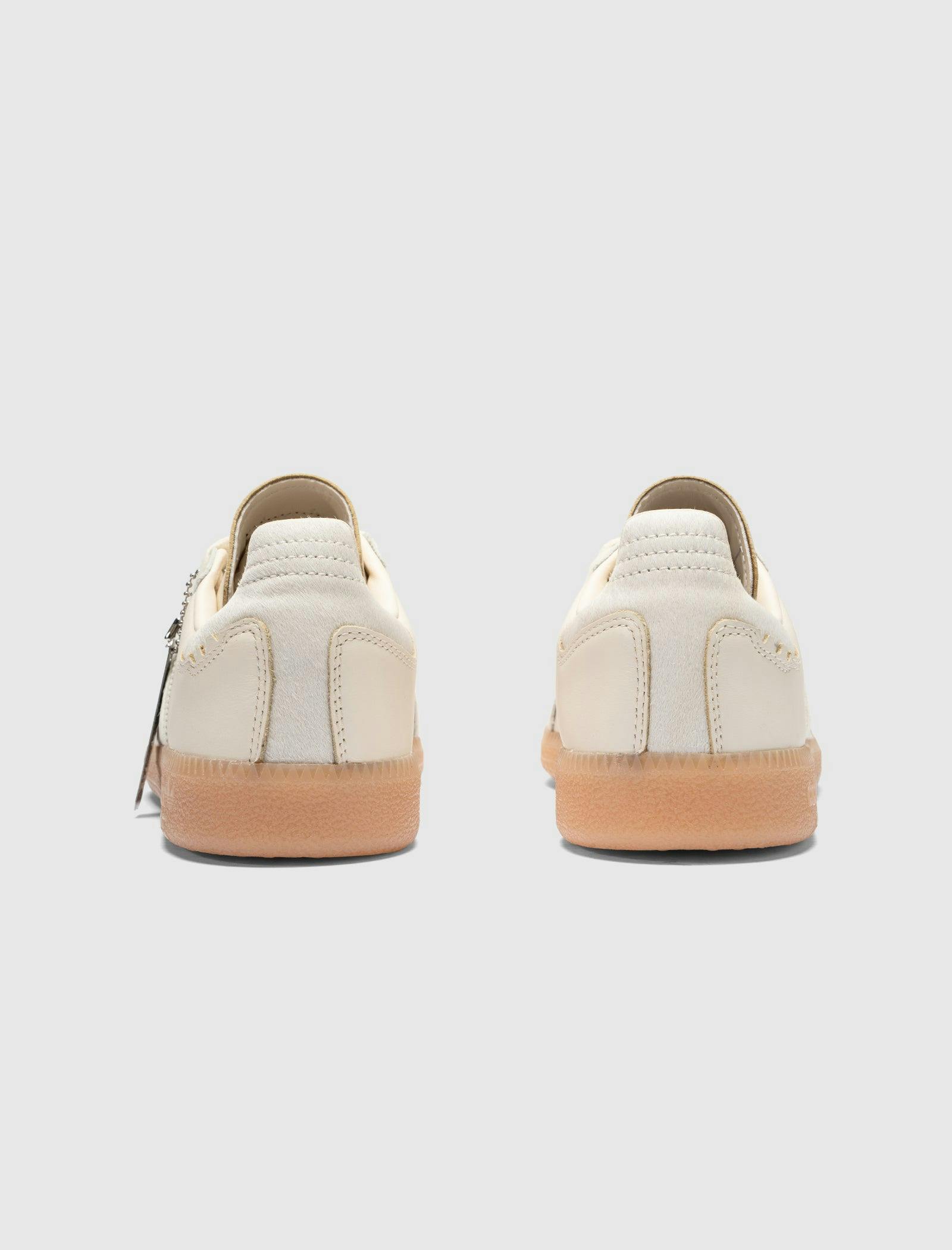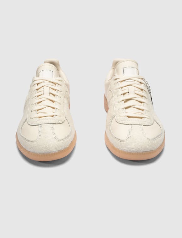 Low top sneakers. Leather upper. Leather overlays around the toe, eyelet panels, side panels, and back of collar. Front lacing. Leather tongue. Leather tongue with a stitched motif patch at the center. Rubber midsole. Rubber outsole. Leather upper