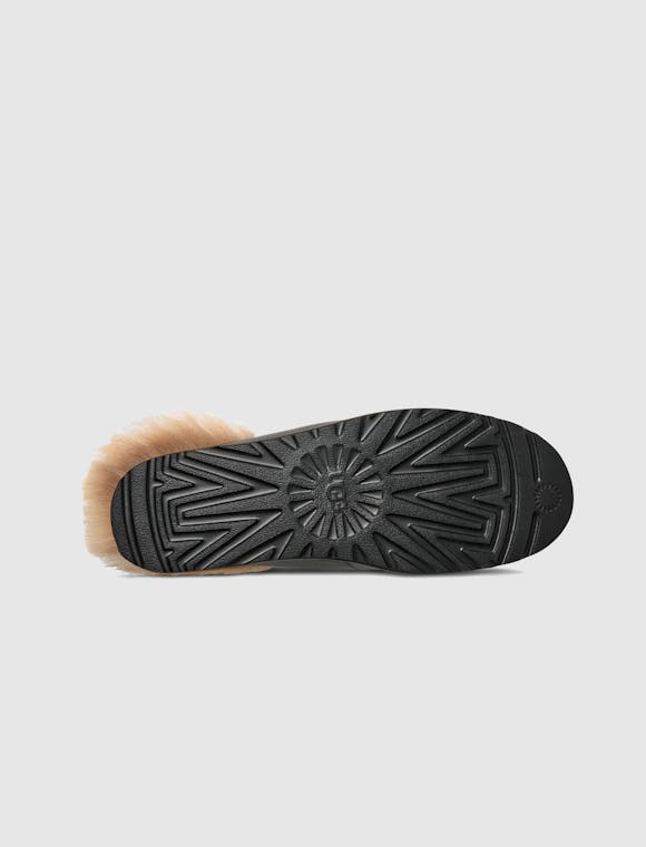 Leather penny loafer. Fur top panel. Fur footbed. Composite foam midsole, and outsole. Treaded outsole.