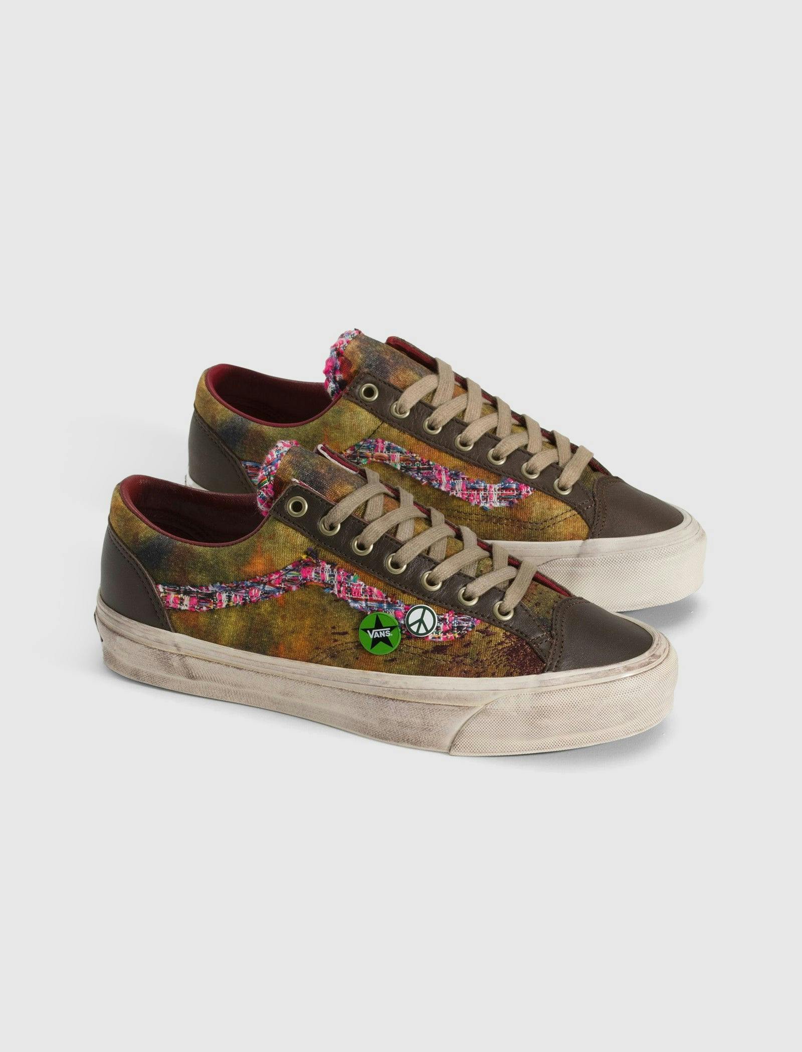 Low top sneakers. Canvas upper with leather accent overlays. Front lacing. Tweed side stripe motifs. Removable pins on the side panels. Rubber midsole. Rubber outsole with waffle-tread. Canvas and leather upper