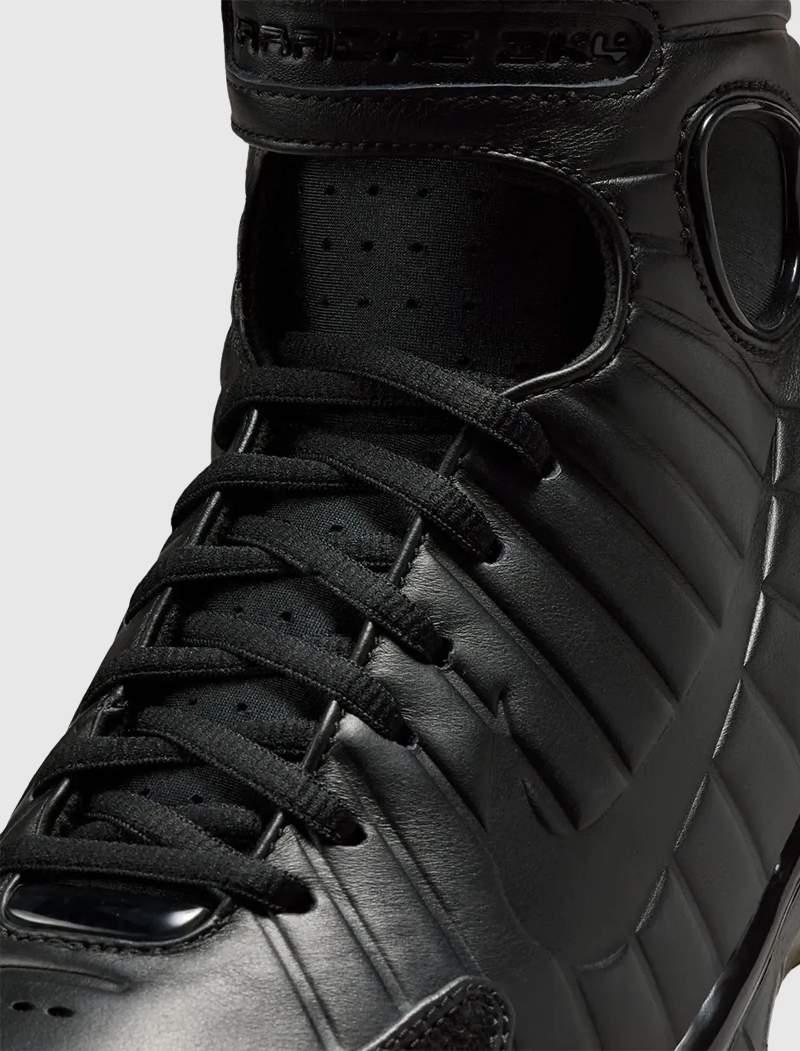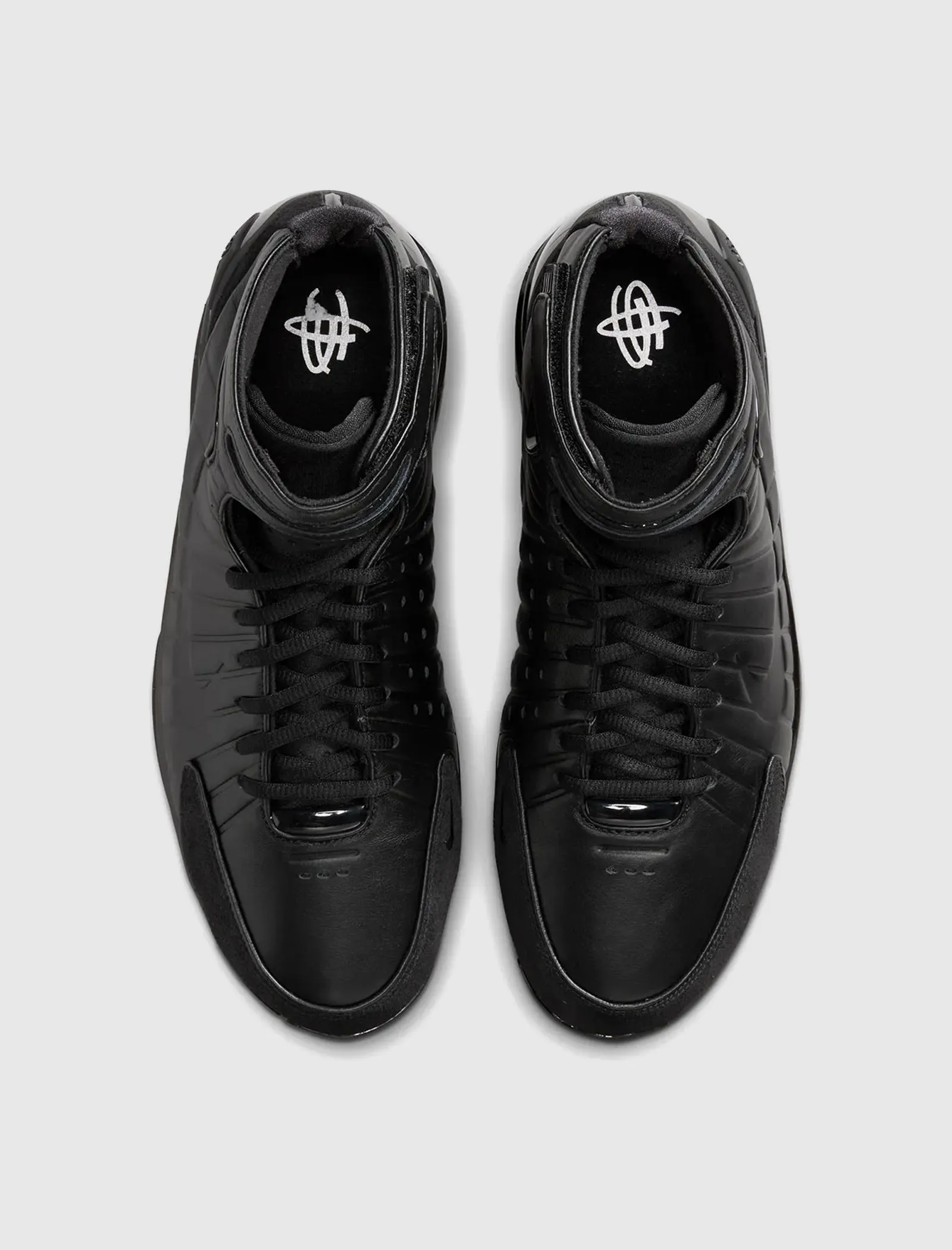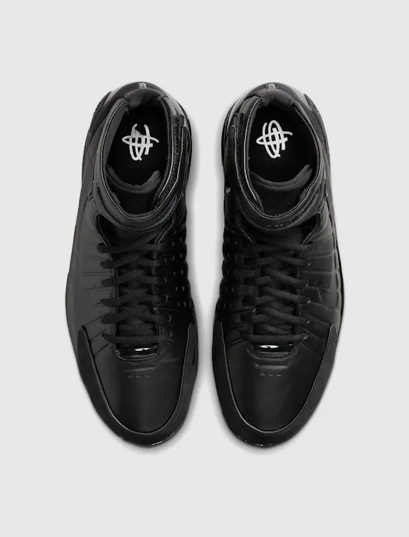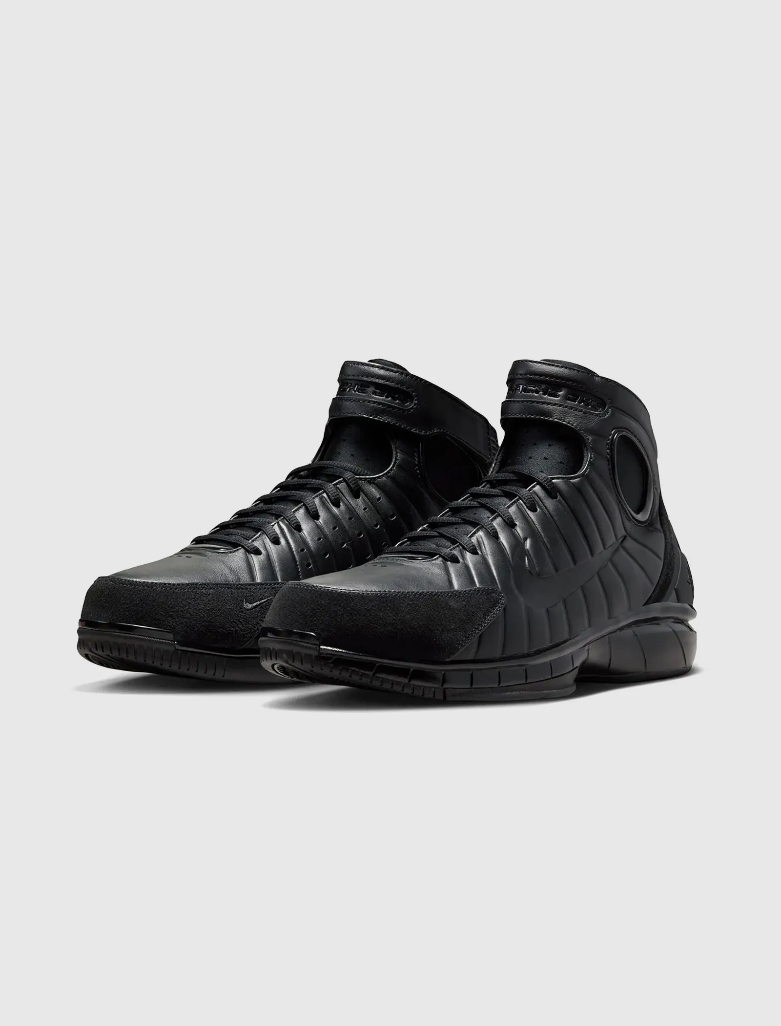 High top sneakers. Leather padded upper. Debossed logo motif on the side panels. Suede overlays around the toe, and heel counter. Front lacing. Velcro strap wrapped around the collar. Synthetic TPU heel counter. Dual Zoom Air unit midsole with Phylon foam cushioning. Carbon fiber shank. Full herringbone pattern rubber outsole. Leather upper