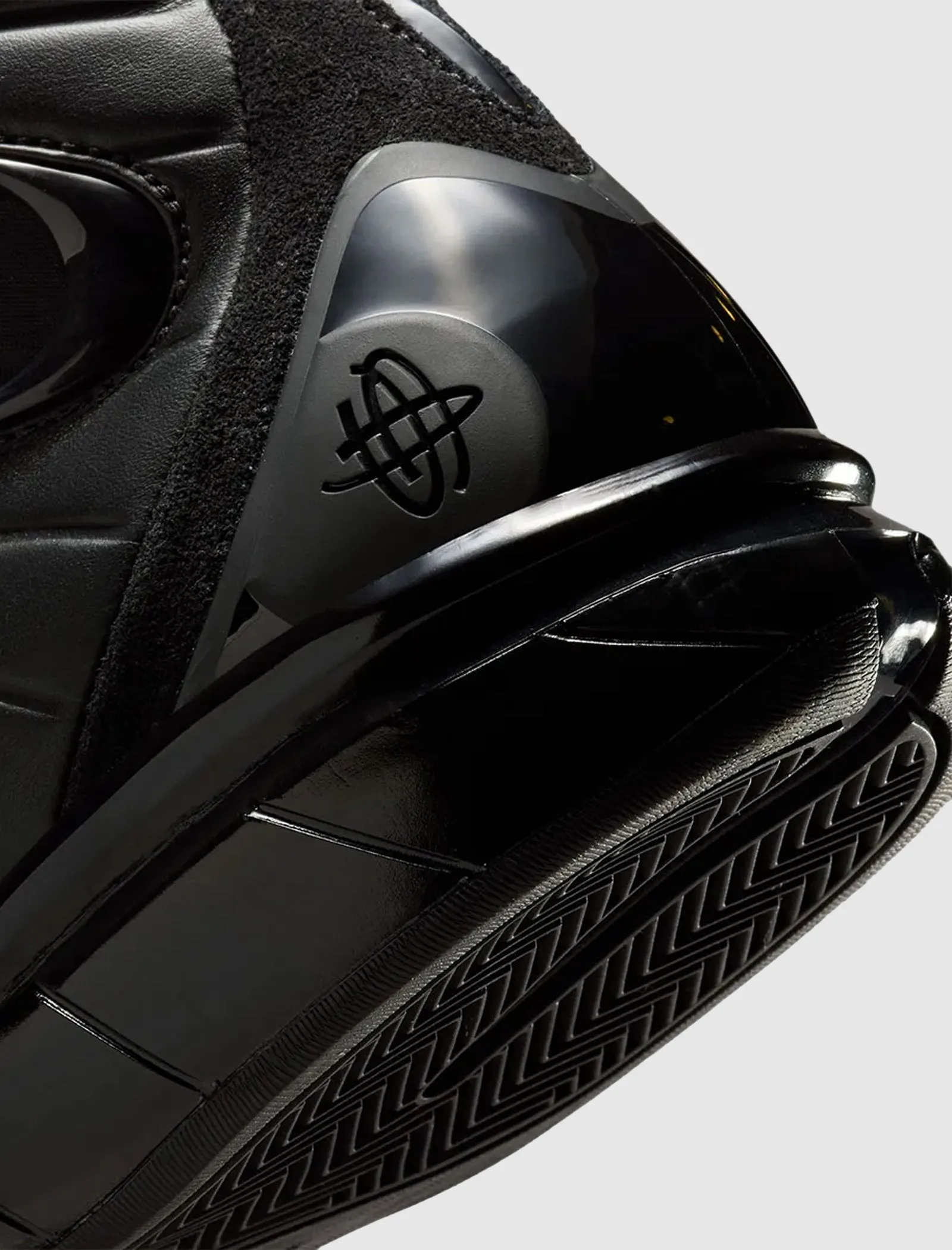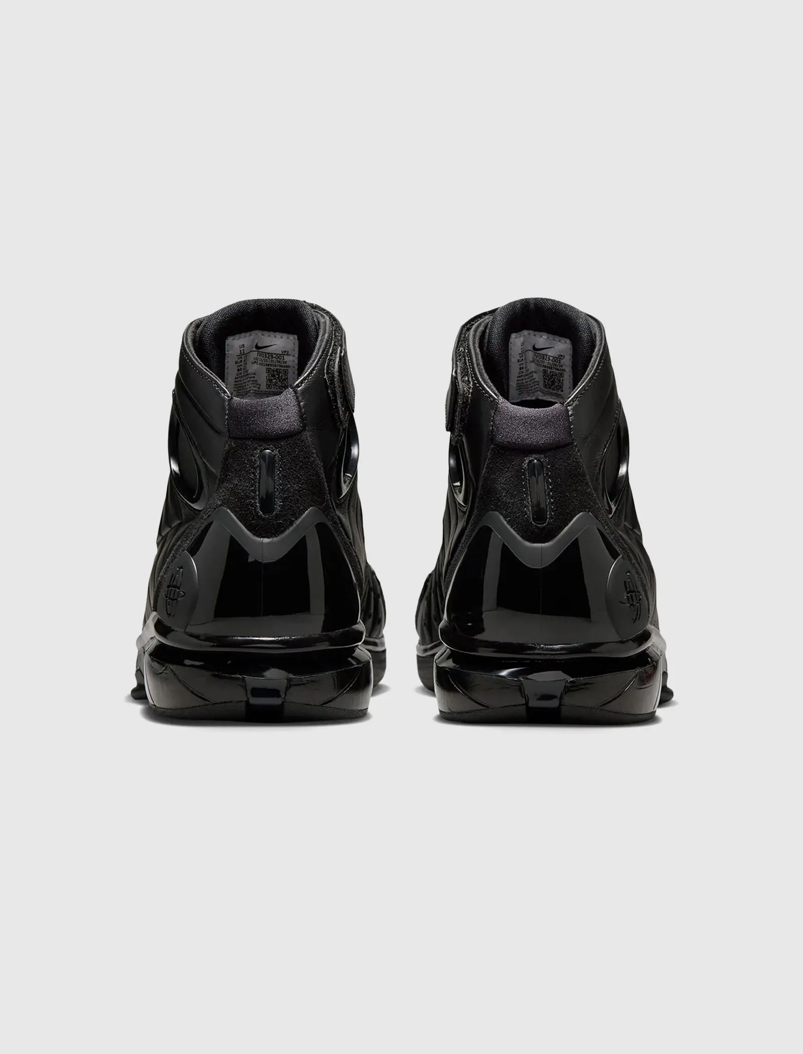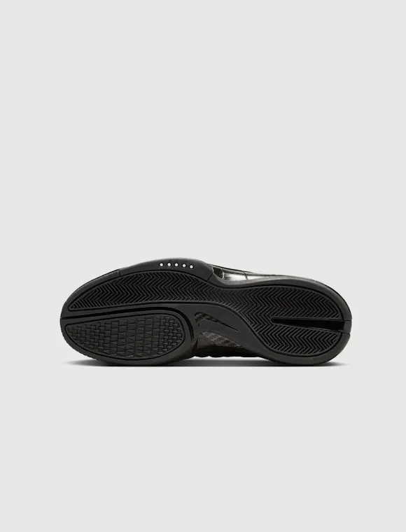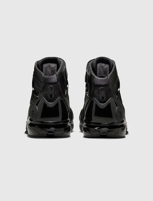High top sneakers. Leather padded upper. Debossed logo motif on the side panels. Suede overlays around the toe, and heel counter. Front lacing. Velcro strap wrapped around the collar. Synthetic TPU heel counter. Dual Zoom Air unit midsole with Phylon foam cushioning. Carbon fiber shank. Full herringbone pattern rubber outsole. Leather upper