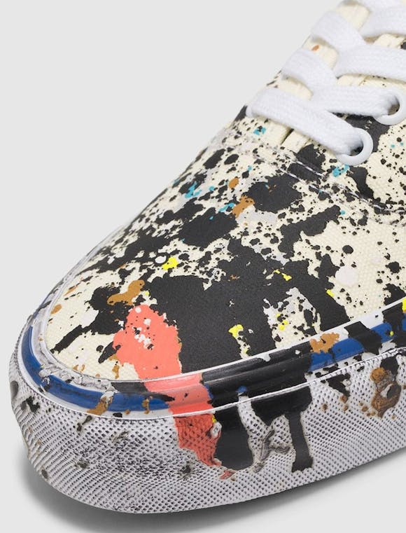 Low top sneakers. Canvas upper. Front lacing. Paint splattered accents on the front of the shoe. Rubber midsole with a printed graphic wrapped around the midsole. Rubber waffle-treaded outsole.